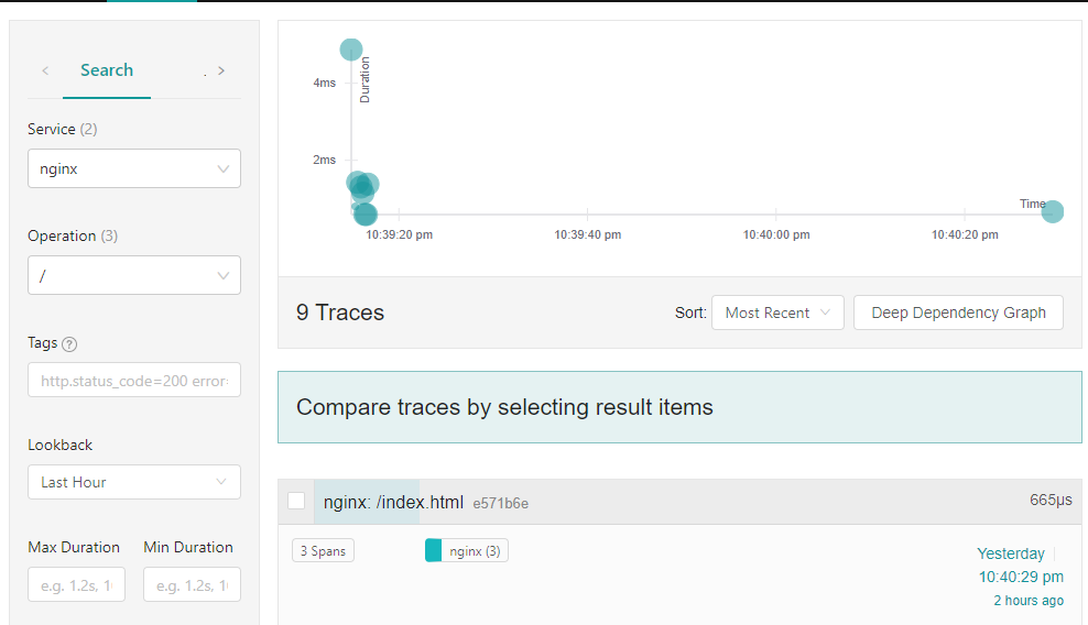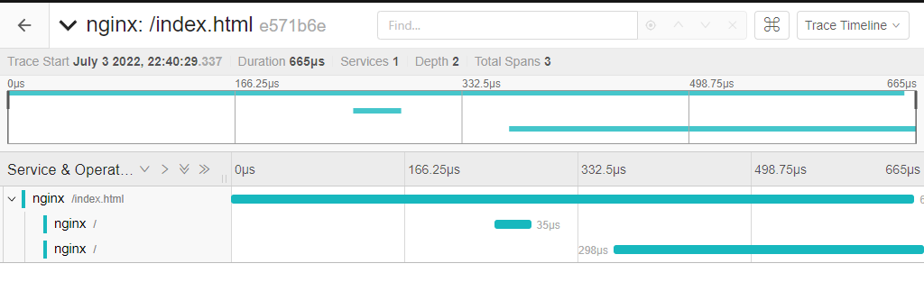 此時我們可以在jaeger上查看,可以看到 NGINX 的 span(因為這里只配置了NGINX,沒有配置更多的后端)。