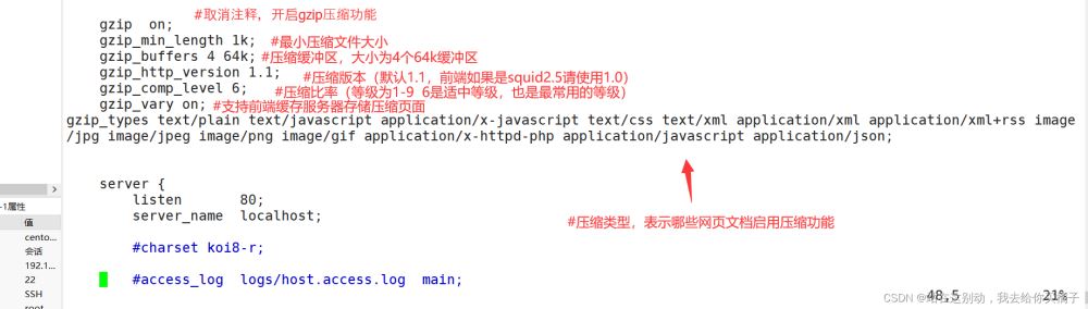 vim /usr/local/nginx/conf/nginx.confhttp {..........gzip on; gzip_min_length 1k; gzip_buffers 4 64k; gzip_http_version 1.1; gzip_comp_level 6; gzip_vary on;gzip_types text/plain text/javascript application/x-javascript text/css text/xml application/xml application/xml+rss image/jpg image/jpeg image/png image/gif application/x-httpd-php application/javascript application/json;}