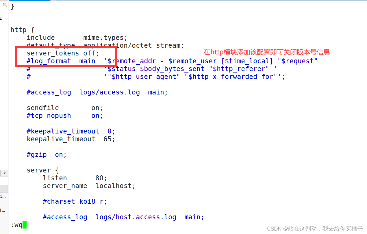vim /usr/local/nginx/conf/nginx.conf http { include mime.types; default_type application/octet-stream; server_tokens on; ...... }