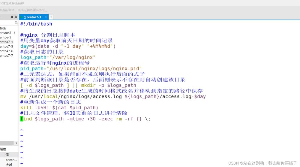 cd /optvim cutlogs.sh #!/bin/bash #nginx 分割日志腳本#用變量day獲取前天日期的時間記錄day=$(date -d "-1 day" "+%Y%m%d")#獲取日志的目錄logs_path="/var/log/nginx"#獲取運行時nginx的進程號pid_path="/usr/local/nginx/logs/nginx.pid"#二元表達式,如果前面不成立則執行后面的式子#前面判斷該目錄是否存在,后面則表示不存在則自動創建該目錄[ -d $logs_path ] || mkdir -p $logs_path#將生成的日志按照date生成的時間格式改名并移動到指定的路徑中保存mv /usr/local/nginx/logs/access.log ${logs_path}/access.log-$day#重新生成一個新的日志kill -USR1 $(cat $pid_path)#日志文件清理,將30天前的日志進行清除find $logs_path -mtime +30 -exec rm -rf {} \ ;