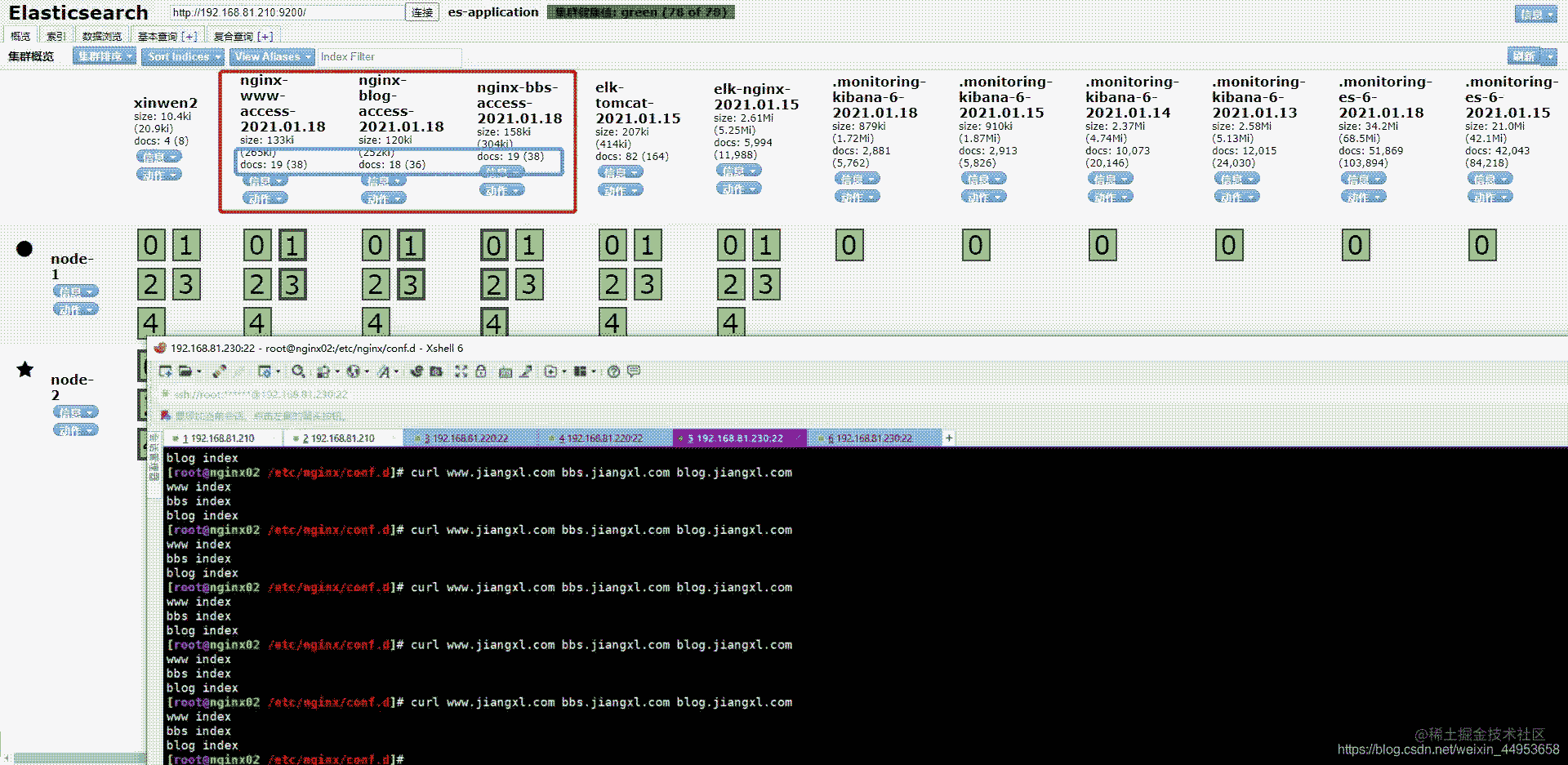 由于nginx集群相同的應用是要寫在同一個索引庫中的,因此我們要觀察每加一個集群產生的數據變化