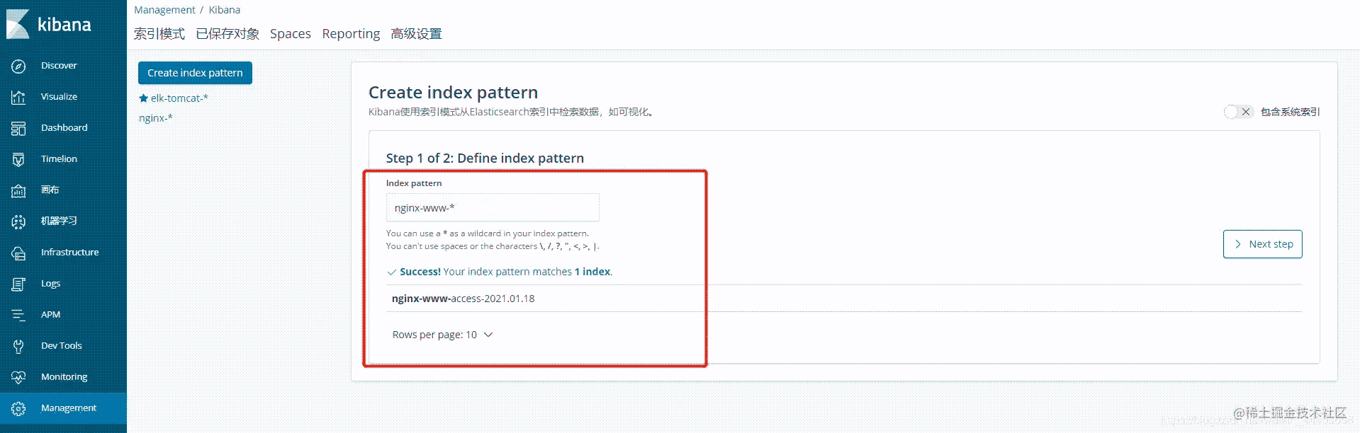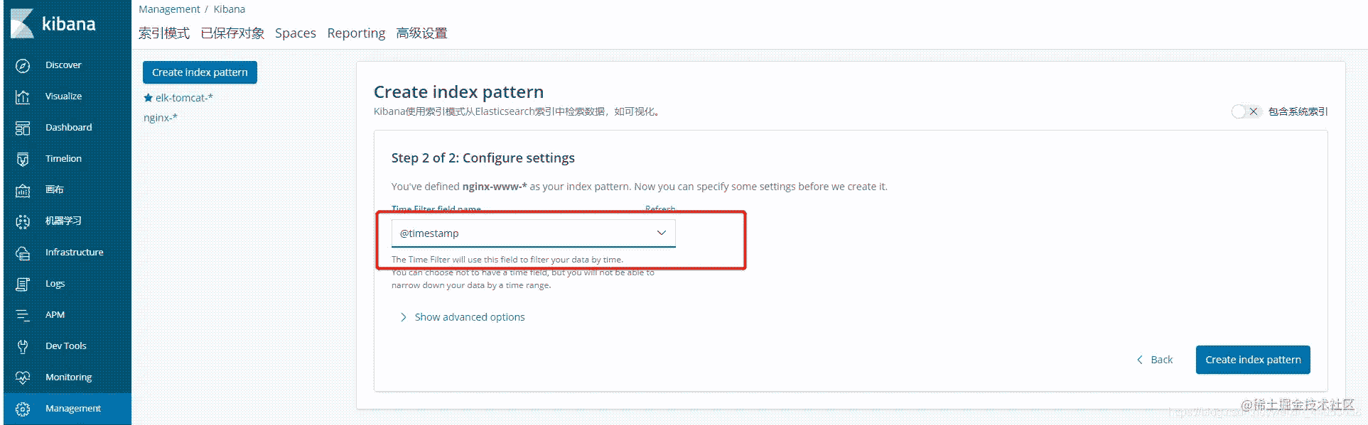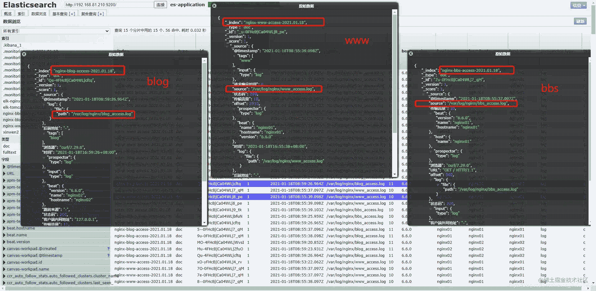 filebeat.inputs:- type: log //一個日志一個type enabled: true //是否寫在es中 paths: //日志路徑 - /var/log/nginx/www_access.log json.keys_under_root: true //開啟json格式解析 json.overwrite_keys: true tags: ["www"] //標記內容,在[]里填寫即可output.elasticsearch: hosts: ["192.168.81.210:9200"] indices: //索引匹配 - index: "nginx-www-access-%{+yyyy.MM.dd}" //索引庫名稱 when.contains: //匹配什么標記tags: "www" //匹配標記為www的日志3.2.配置filebeat不同日志使用不同索引庫