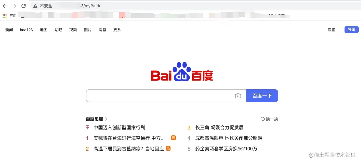 location /myBaidu { return 302 http://baidu.com;}- 這種方案會直接跳轉到baidu,并且會改變域名,相當于直接location.href = 'baidu.com' ,顯然并不適合我們的需求。