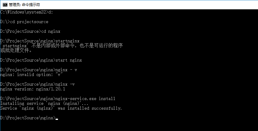 4、cmd(管理員身份)進入nginx的安裝目錄,執行:nginx-service.exe install命令,然后進入系統服務,看是否注冊nginx服務成功并且檢查是否設置為自動啟動