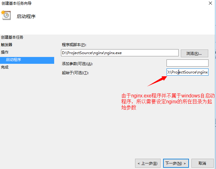 5.點擊下一步,程序或腳本選擇nginx.exe所在目錄,要把下面的起始于 處填上 nginx.exe的所在路徑 點擊下一步