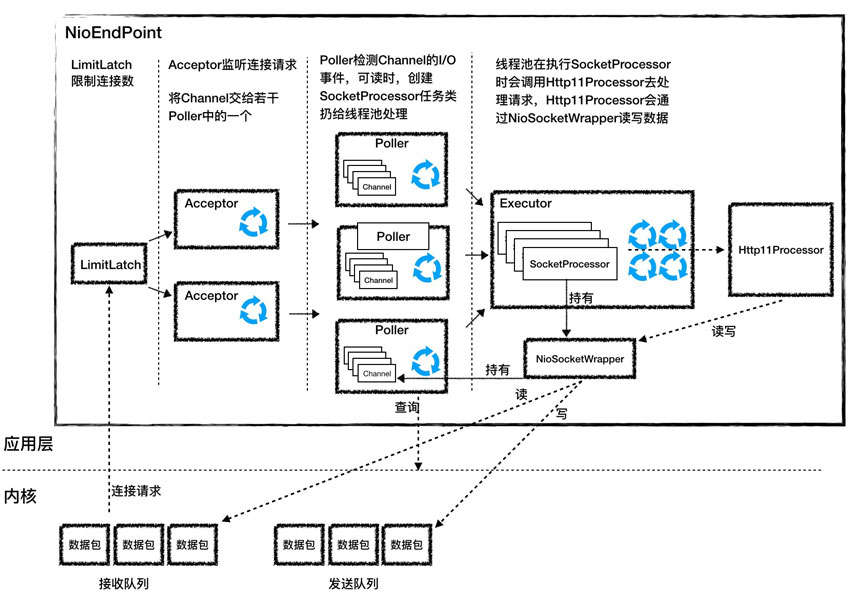 其中 Acceptor 用于監(jiān)聽(tīng) Socket 連接請(qǐng)求。SocketProcessor用于處理 Acceptor 接收到的 Socket請(qǐng)求,它實(shí)現(xiàn) Runnable接口,在 Run方法里調(diào)用應(yīng)用層協(xié)議處理組件 Processor 進(jìn)行處理。為了提高處理能力,SocketProcessor被提交到線(xiàn)程池來(lái)執(zhí)行。