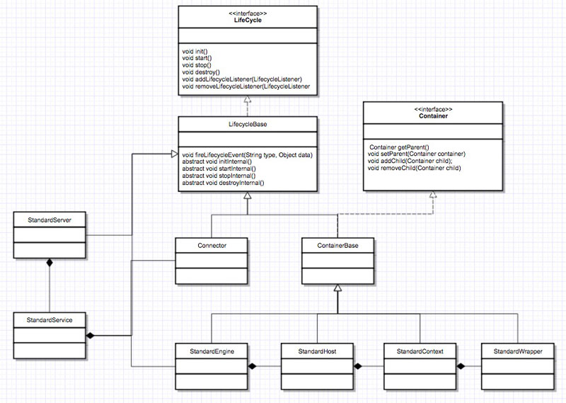 Tomcat 定義一個(gè)基類(lèi) LifeCycleBase 來(lái)實(shí)現(xiàn) LifeCycle 接口,把一些公共的邏輯放到基類(lèi)中去,比如生命狀態(tài)的轉(zhuǎn)變與維護(hù)、生命事件的觸發(fā)以及監(jiān)聽(tīng)器的添加和刪除等,而子類(lèi)就負(fù)責(zé)實(shí)現(xiàn)自己的初始化、啟動(dòng)和停止等方法。