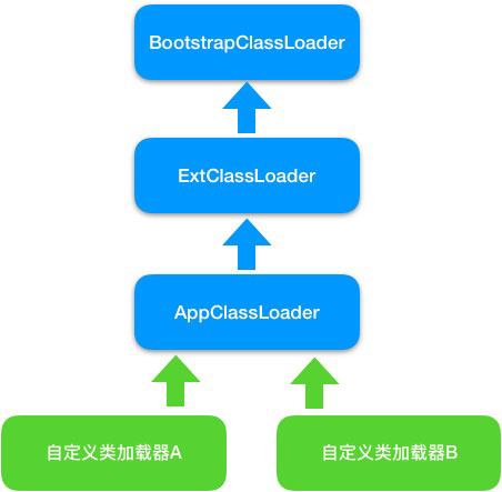 public Class<?> loadClass(String name) throws ClassNotFoundException { return loadClass(name, false);}protected Class<?> loadClass(String name, boolean resolve) throws ClassNotFoundException{ synchronized (getClassLoadingLock(name)) {// 查找該 class 是否已經(jīng)被加載過(guò)Class<?> c = findLoadedClass(name);// 如果沒(méi)有加載過(guò)if (c == null) { // 委托給父加載器去加載,遞歸調(diào)用 if (parent != null) {c = parent.loadClass(name, false); } else {// 如果父加載器為空,查找 Bootstrap 是否加載過(guò)c = findBootstrapClassOrNull(name); } // 若果依然加載不到,則調(diào)用自己的 findClass 去加載 if (c == null) {c = findClass(name); }}if (resolve) { resolveClass(c);}return c; }}protected Class<?> findClass(String name){ //1. 根據(jù)傳入的類(lèi)名 name,到在特定目錄下去尋找類(lèi)文件,把.class 文件讀入內(nèi)存 ...//2. 調(diào)用 defineClass 將字節(jié)數(shù)組轉(zhuǎn)成 Class 對(duì)象return defineClass(buf, off, len);}// 將字節(jié)碼數(shù)組解析成一個(gè) Class 對(duì)象,用 native 方法實(shí)現(xiàn)protected final Class<?> defineClass(byte[] b, int off, int len){ ...}JDK 中有 3 個(gè)類(lèi)加載器,另外你也可以自定義類(lèi)加載器,它們的關(guān)系如下圖所示。