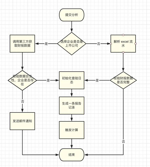 上市企業(yè):判斷名稱(chēng)是否存在 ,不存在則發(fā)送郵件并中止計(jì)算-> 從數(shù)據(jù)庫(kù)拉取財(cái)報(bào)數(shù)據(jù),初始化查驗(yàn)日志、生成一條報(bào)告記錄,觸發(fā)計(jì)算-> 根據(jù)失敗與成功修改任務(wù)狀態(tài) 。