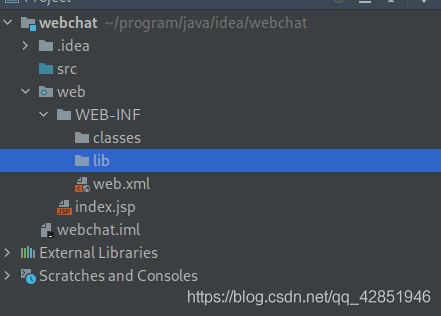 展開工程名->web->WEB-INF,在WEB-INF下新建兩個文件夾,分別是classes、lib: