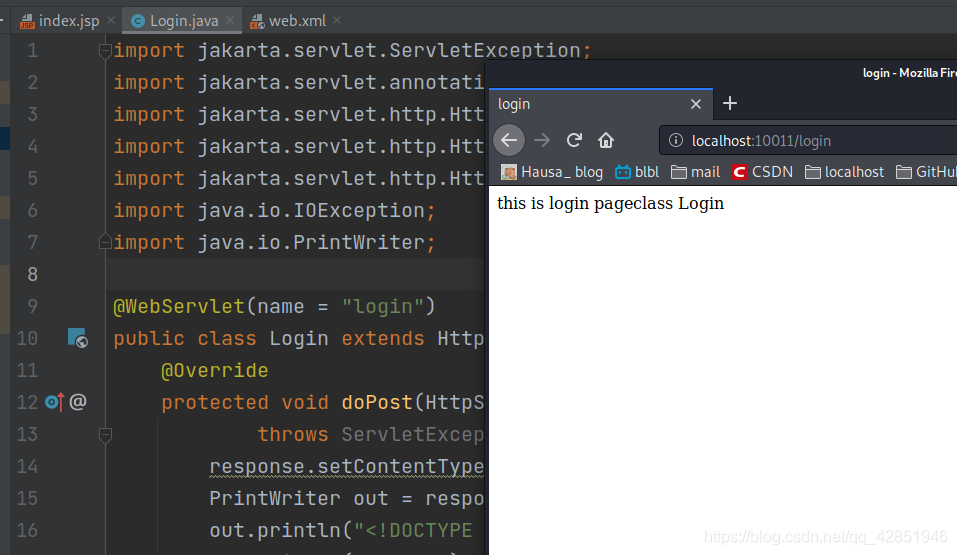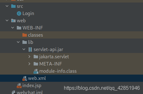 import jakarta.servlet.ServletException;import jakarta.servlet.annotation.WebServlet;import jakarta.servlet.http.HttpServlet;import jakarta.servlet.http.HttpServletRequest;import jakarta.servlet.http.HttpServletResponse;import java.io.IOException;import java.io.PrintWriter;@WebServlet(name = "login")public class Login extends HttpServlet { @Override protected void doPost(HttpServletRequest request, HttpServletResponse response) throws ServletException, IOException {response.setContentType("text/html");PrintWriter out = response.getWriter();out.println("<!DOCTYPE HTML>");out.println("<HTML>");out.println(" <HEAD><TITLE>login</TITLE></HEAD>");out.println(" <BODY>");out.print(" this is login page");out.print(this.getClass());out.println(" </BODY>");out.println("</HTML>");out.flush();out.close(); } @Override protected void doGet(HttpServletRequest request, HttpServletResponse response) throws ServletException, IOException {response.setContentType("text/html");PrintWriter out = response.getWriter();out.println("<!DOCTYPE HTML>");out.println("<HTML>");out.println(" <HEAD><TITLE>login</TITLE></HEAD>");out.println(" <BODY>");out.print(" this is login page");out.print(this.getClass());out.println(" </BODY>");out.println("</HTML>");out.flush();out.close(); }}然后修改web.xml文件,如下: