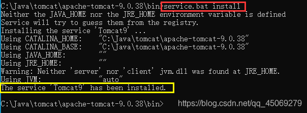 再進(jìn)入到tomcat的 bin 目錄中,輸入service.bat install