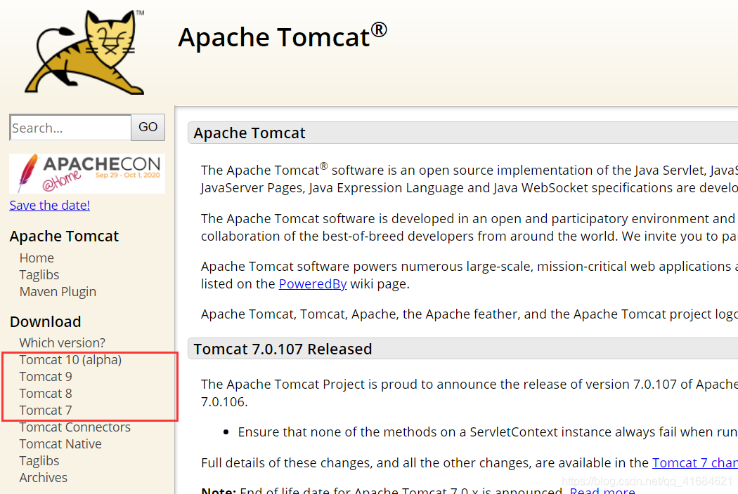 去Apache官網下載Tomcat8.5的安裝包,https://tomcat.apache.org/