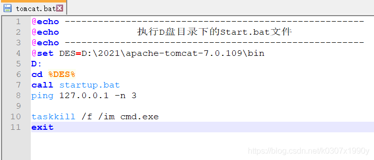 @echo ------------------------------------------------------@echo ? ? ? ? ? ? ?執行D盤目錄下的Start.bat文件@echo ------------------------------------------------------@set DES=D:\2021\apache-tomcat-7.0.109\binD:cd %DES%call startup.batping 127.0.0.1 -n 3taskkill /f /im cmd.exeexit