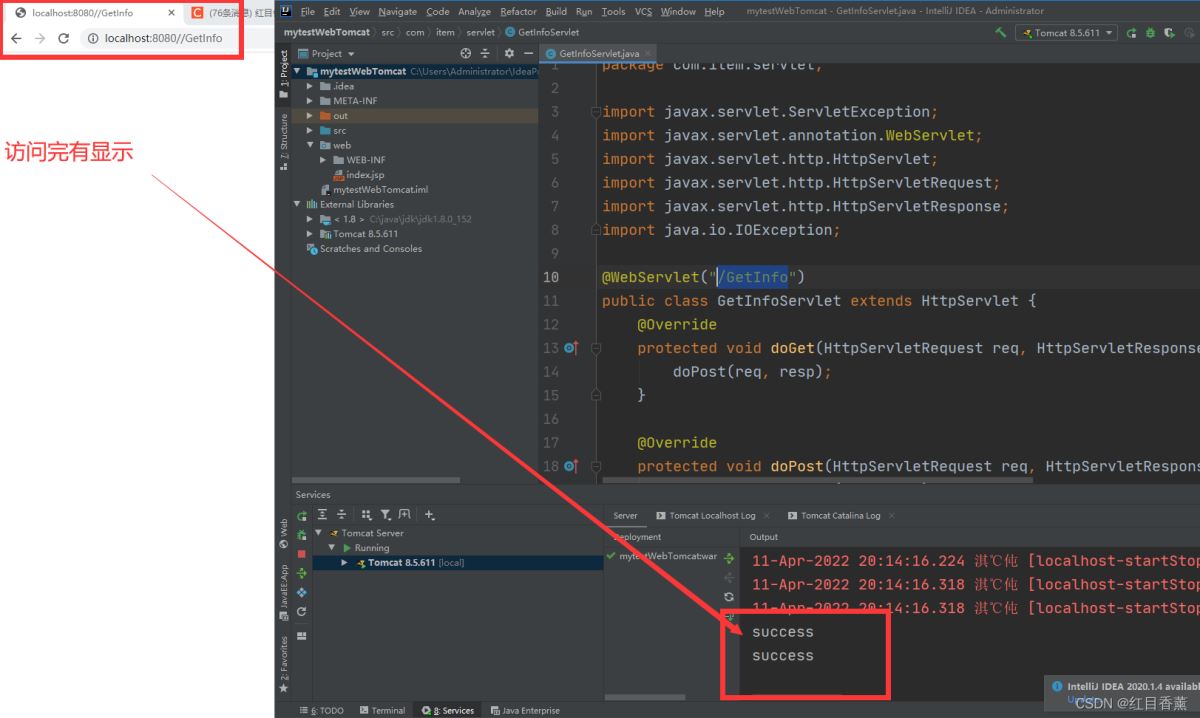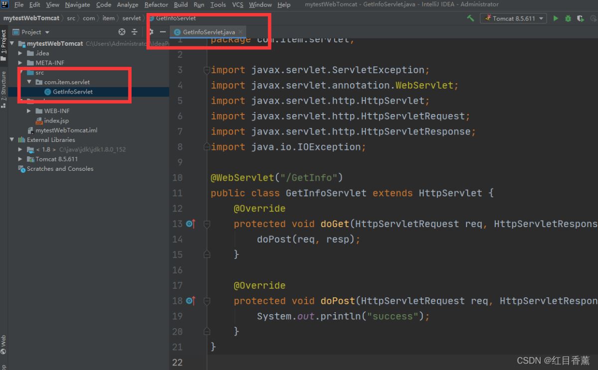 package com.item.servlet; import javax.servlet.ServletException;import javax.servlet.annotation.WebServlet;import javax.servlet.http.HttpServlet;import javax.servlet.http.HttpServletRequest;import javax.servlet.http.HttpServletResponse;import java.io.IOException; @WebServlet("/GetInfo")public class GetInfoServlet extends HttpServlet { @Override protected void doGet(HttpServletRequest req, HttpServletResponse resp) throws ServletException, IOException {doPost(req, resp); } @Override protected void doPost(HttpServletRequest req, HttpServletResponse resp) throws ServletException, IOException {System.out.println("success"); }}項目結構