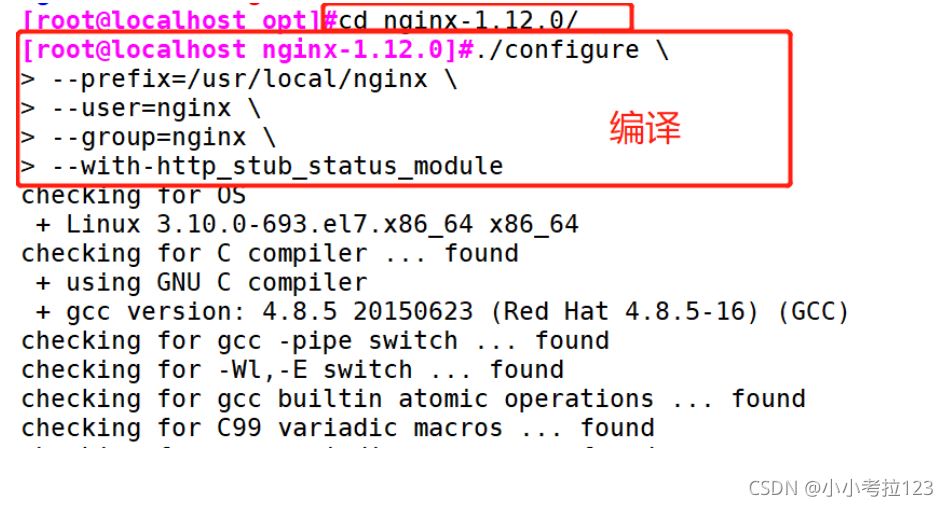 1. #關(guān)閉防火墻systemctl stop firewalldsetenforce 0?2. #安裝依賴關(guān)系包yum -y install pcre-devel zlib-devel gcc gcc-c++ make?3. #新建用戶和組便于管理useradd -M -s /sbin/nologin nginx?4. #切換至opt目錄,將下載好的壓縮包傳進(jìn)來解壓cd /opttar -zxf nginx-1.12.0.tar.gz ?4. #切換至解壓后的目錄下編譯cd nginx-1.12.0?./configure