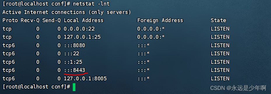 其中keystoreFile參數指定的是證書文件的位置,而keystorePass參數指定的是生成該證書的密碼。這樣,我們的tomcat就支持使用https了,并且監聽端口為8443。我們重啟Tomcat,發現Tomcat在啟動后悔監聽8443端口,如下所示: