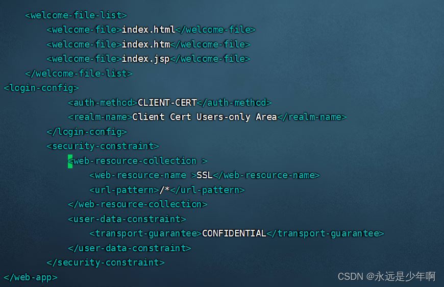 <login-config> <auth-method>CLIENT-CERT</auth-method> <realm-name>Client Cert Users-only Area</realm-name></login-config><security-constraint> <web-resource-collection > <web-resource-name >SSL</web-resource-name> <url-pattern>/*</url-pattern> </web-resource-collection> <user-data-constraint> <transport-guarantee>CONFIDENTIAL</transport-guarantee> </user-data-constraint></security-constraint>