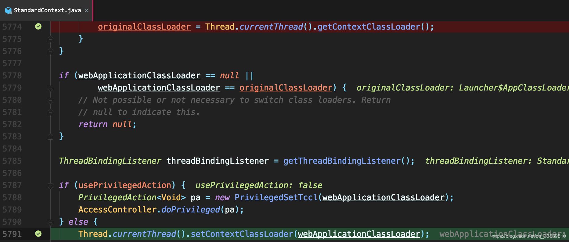 在StandardContext的啟動方法,會將當前線程的上下文加載器設置為WebAppClassLoader。