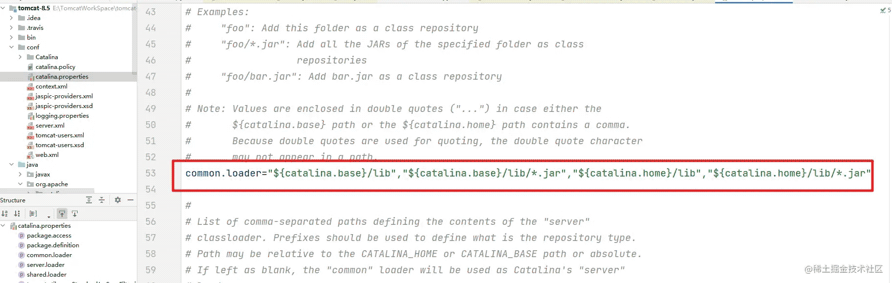 以應(yīng)用類加載器為父類,是tomcat頂層的公用類加載器,其路徑由conf/catalina.properties中的common.loader指定,默認指向${catalina.base}/lib下的包。
