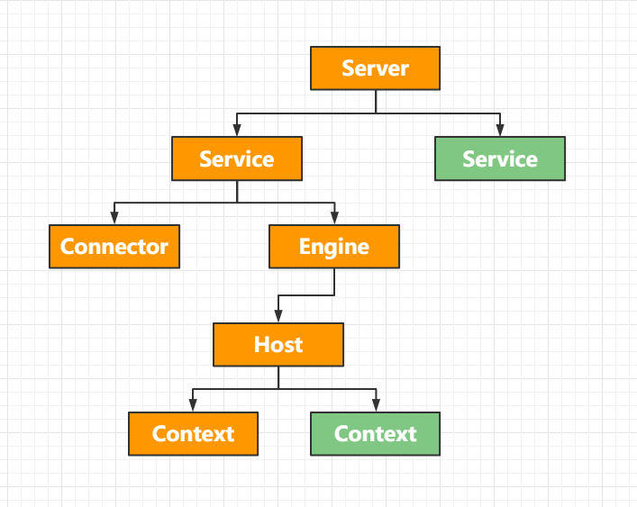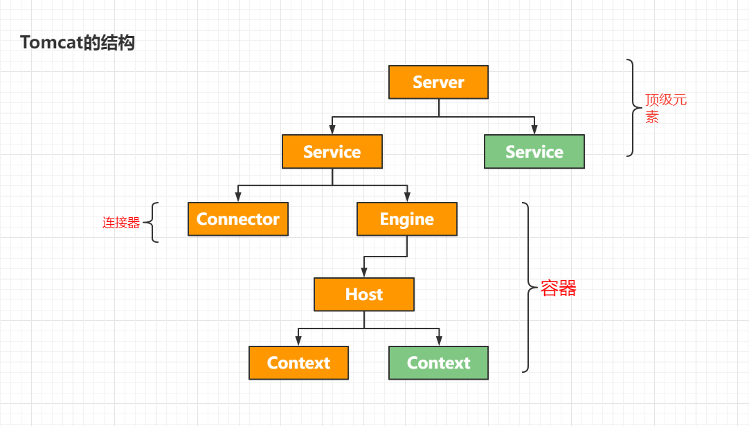 <Server> <Service><Connector /><Connector /><Engine> <Host><Context /><!-- 現在常常使用自動部署,不推薦配置Context元素,Context小節有詳細說明 --> </Host></Engine> </Service></Server>