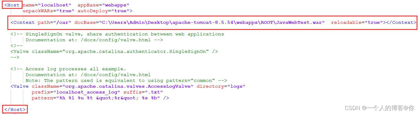 <Context path="/car" docBase="C:\Users\Admin\Desktop\apache-tomcat-8.5.54\webapps\ROOT\JavaWebTest.war" reloadable="true"></Context>