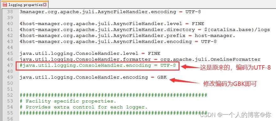 4、細(xì)心的你會發(fā)現(xiàn)啟動Tomcat后,產(chǎn)生的日志有亂碼的情況出現(xiàn),不要慌,這并不影響你項目的正常運(yùn)行。這是由于編碼不一致引起的,Tomcat啟動后默認(rèn)編碼UTF-8,而Windows的默認(rèn)編碼是GBK。因此你想讓其不亂碼,只需配置apache-tomcat-8.5.54\conf\logging.properties的編碼格式即可,如下圖: