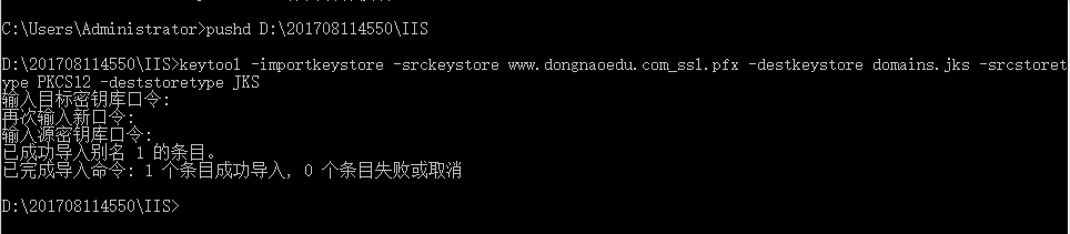 keytool -importkeystore -srckeystorewww.dongnaoedu.com_ssl.pfx?-destkeystoredomains.jks?-srcstoretype PKCS12 -deststoretype JKS