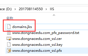 這里要輸入密碼,就是上面www.dongnaoedu.com_pfx_password.txt文本文件中的密碼,3個口令最好都輸入這個密碼。可以看到文件夾中生成了domains.jks證書