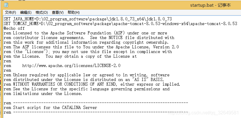 2、然后將startup.bat進行編輯,在文件內容的開頭加入如下內容,具體根據自己安裝的位置來確定。