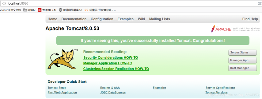 4.如果以上問題都解決了,在瀏覽器的地址欄中輸入“http://localhost:8080”,如果出現一個有小貓的界面,那就說明問題已經解決了,但是如果仍然有問題,就按照上面的方法來檢查,看是哪兒出現了錯誤。打開的網址的時候前提startup.bat已經在運行。不然還是不能正常顯示的。