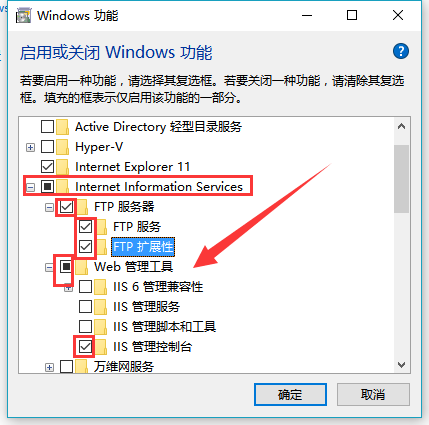 3.在“windows功能”中找到“Internet Information Services”,并選中“FTP服務(wù)”、“FTP擴(kuò)展性”和“IIS管理控制臺”前的復(fù)選框,點擊“確定”,如下圖所示:
