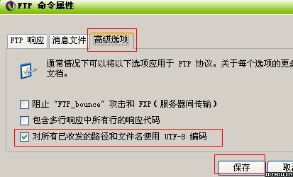步驟4:點擊“全局屬性。。。”后會彈出全局屬性設置窗口,我們選擇“高級選項”就可以在這里看到編碼的設置。Serv-u 7默認是使用UTF-8編碼,我們將“對所有已收發的路徑和文件名使用UTF-8編碼”前的鉤去掉就解決了Serv-u 7下中文名無法刪除問題及偶爾出現的亂碼問題。