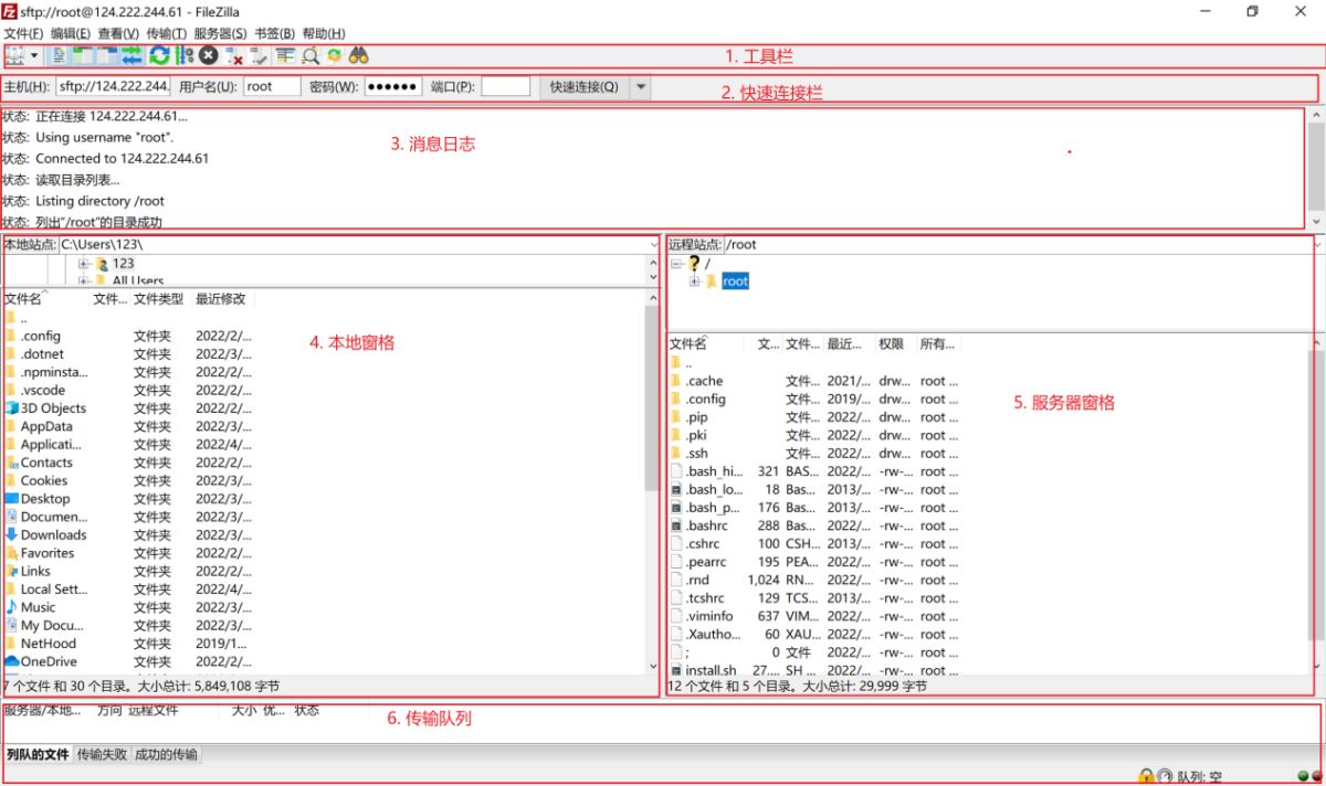 (5) 服務器窗格:顯示您連接到的服務器上的文件和目錄。