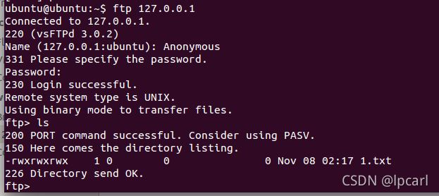 ftp 127.0.0.1然后輸入用戶名Anonymous最后輸入ls如果初現(xiàn)如圖所示的效果即代表創(chuàng)建成功