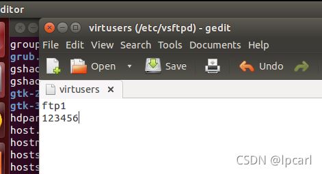 mkdir -p /home/ftpuser/ftp1chown ftpuser.ftpuser /home/ftpusercd /etc/vsftpd/virtualconf/gedit ftp1