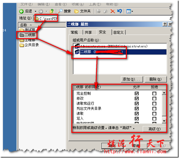 也許你會問,此圖中怎么沒有看到單獨的用戶訪問權限呢?那是因為圖中的“二線部”是一個組,這個就是AD中的一個組了。上圖中權限是只要是AD的二線部組中的所有成員都可以對目錄“二線部”進行相關的操作。