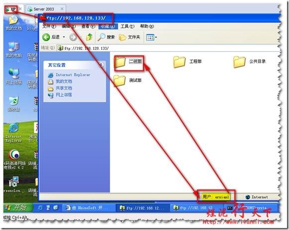 通過以上截圖,我們可以知道現在“erxian1”用戶,已經可以登陸FTP,同時還可以在“二線部”此目錄下新建文件夾。那么我們此時切換到“測試部”目錄下看看能不能進去。