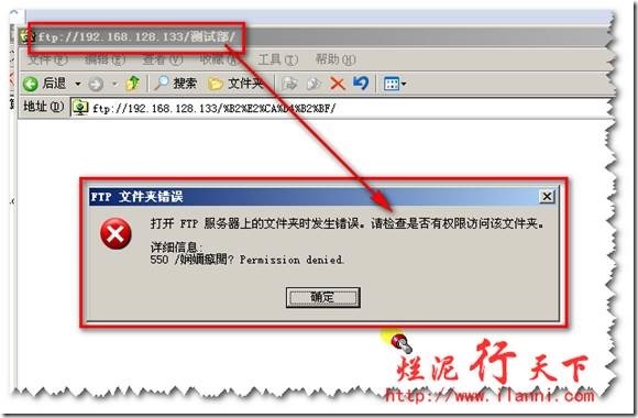 可以看到提示沒有權限訪問。那就說明我們的目的達到了,通過Server-U提供FTP服務,由AD來提供賬戶,由NTFS進行權限的設置。