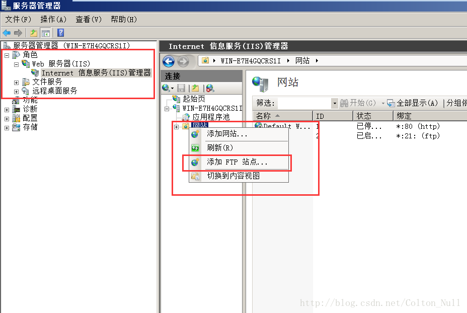 3.建立FTP站點 點擊左側(cè)【角色】–>【web服務(wù)器(IIS)】–> Internet 信息服務(wù)(IIS)管理器 在右側(cè)窗口中找到網(wǎng)站,并點擊右鍵