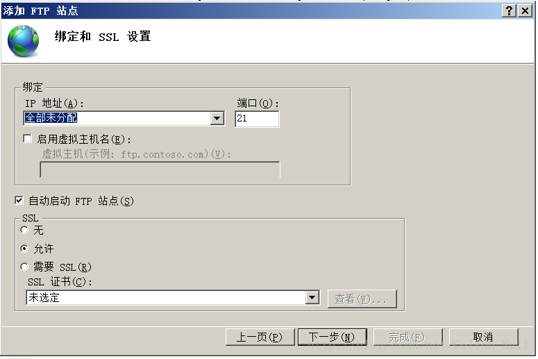 IP地址選擇【全部未分配】,端口號默認(rèn)為21即可。