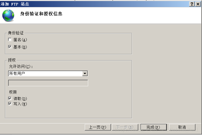 身份驗證一定要勾選【基本】,授權(quán)的話可以是所有用戶,也可以是指定用戶。下面的【讀取】和【寫入】要記得勾選。