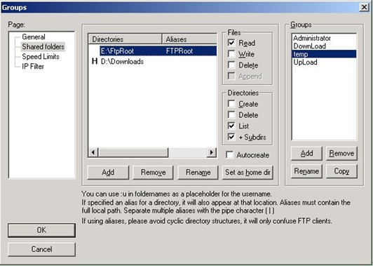 比如本例,主目錄是D:\Downloads,如果不做虛擬路徑設置,那么客戶端登錄進來只能看到主目錄里面的內容,還有一個E:\FTPRoot目錄下面的東西看不到。如何設置虛擬路徑?鼠標右鍵點擊列表中的“E:\FTPRoot”目錄,在彈出的菜單里面選“Edit aliases”編輯別名;現在要把E:\FTPRoot目錄作為客戶端主目錄下的FTPRoot目錄,那么就在彈出的窗口里面輸入“D:\Downloads\FTPRoot”并點擊“OK”按鈕確定。注意拼寫規則,路徑的前面部分必須是主目錄的絕對路徑。這樣設置之后,在客戶端就可以看到一個“FTPRoot”目錄,這個目錄其實就是E:\FTPRoot目錄。
