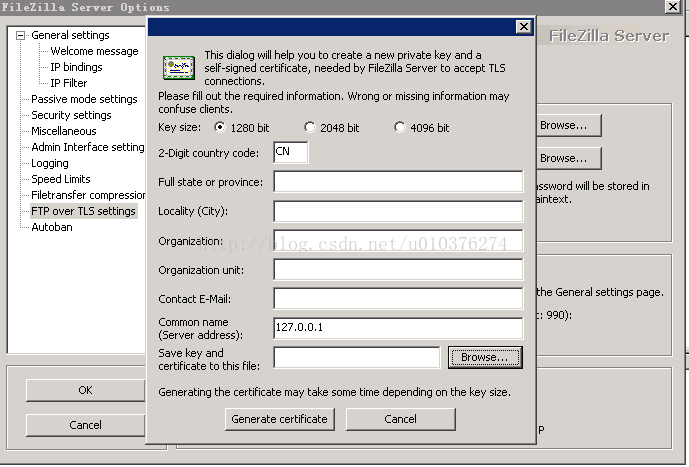 空白處都可以隨便填,注意Common name (Server address)那里填127.0.0.1就行了,下面給密鑰和證書選一個保存的位置,然后點最下方Generate certificate