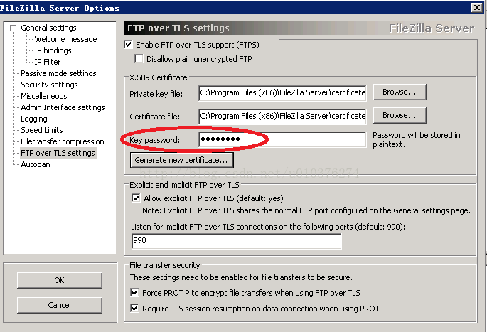選FTP over TLS settings,勾選Enable FTP over TLS support,然后點擊中間Generate new certificate...按鈕