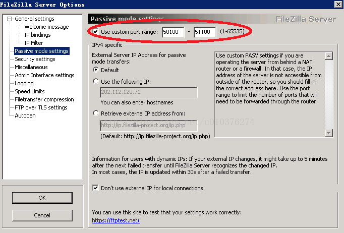 在Passive mode settings里勾選Use custom port range,如果讓防火墻對1-65535端口全部開放有些危險,所以先在這里限定好端口范圍