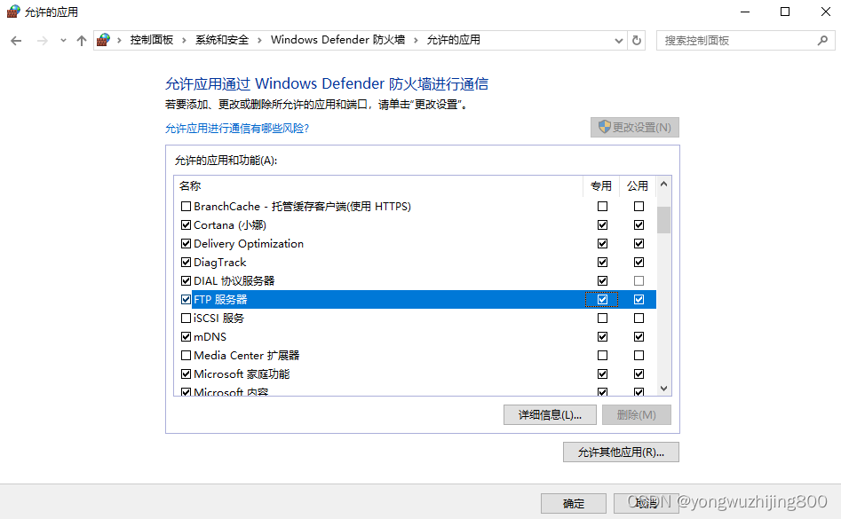 點擊“更改設置”,將ftp服務器前面的對勾打上,將后面的專用和共用的對勾也打上。