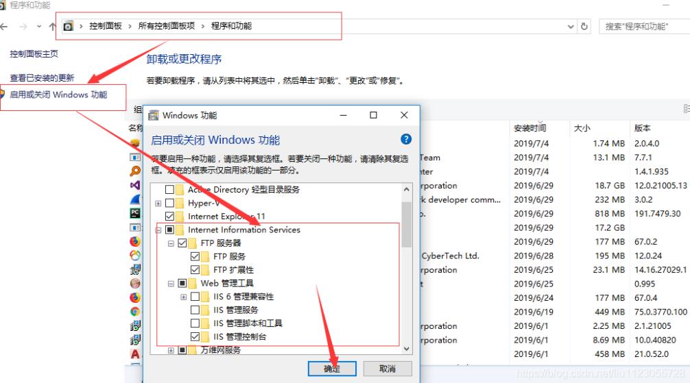 點擊程序與功能→啟動或關閉Windows功能,選擇一下選項,打開ftp服務