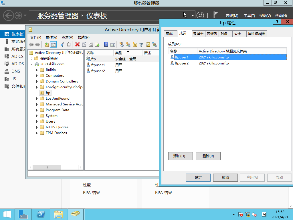 1、將FTP服務器加入域控制器中,其完全域名為ftp.2021skills. com