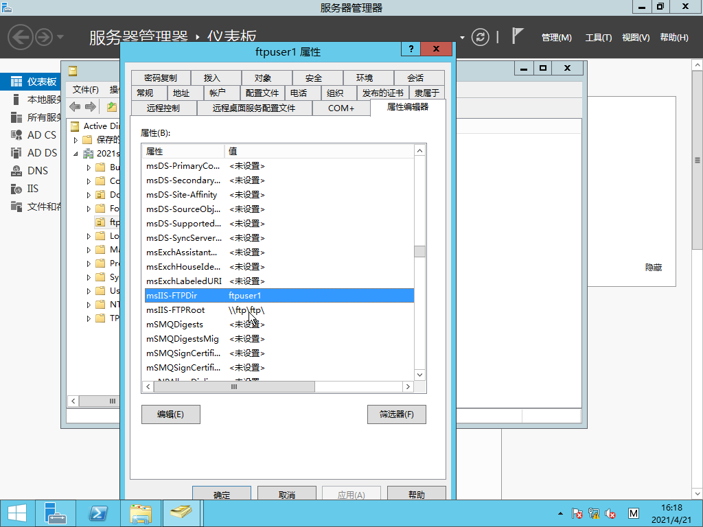 10.選擇用戶-屬性-屬性編輯器修改msIIS-FTPRoot和msIIS-FTPDir
